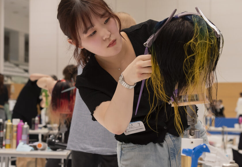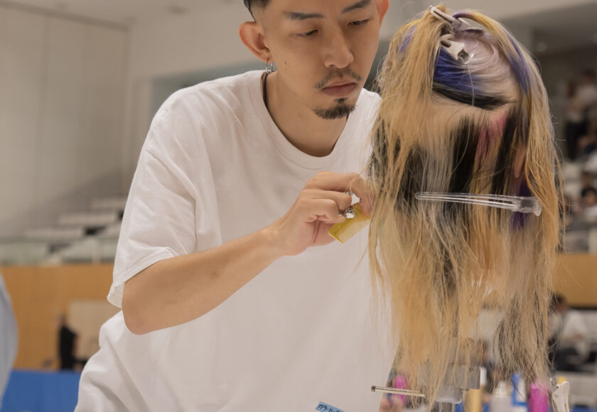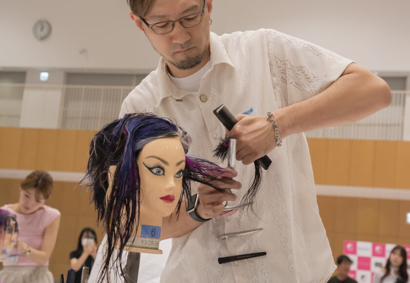 ⑥モデルウイッグの髪は、競技開始前に完全に濡らし、オールバックにシェープしておく。選手は髪が濡れた状態からカットに入らなければならない。