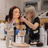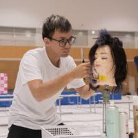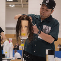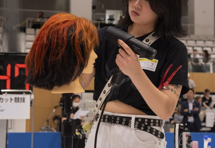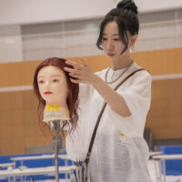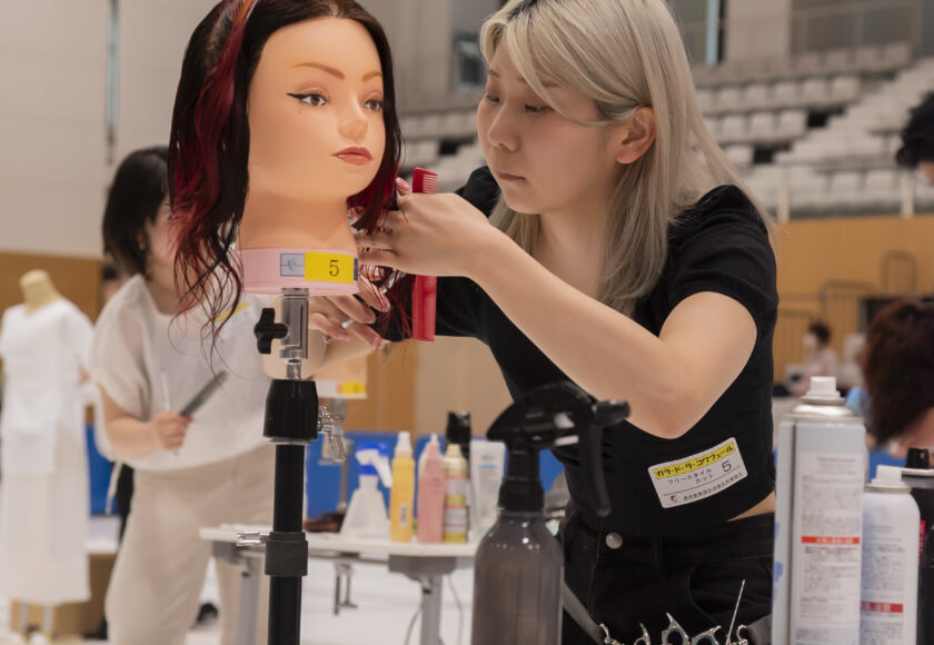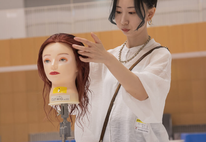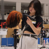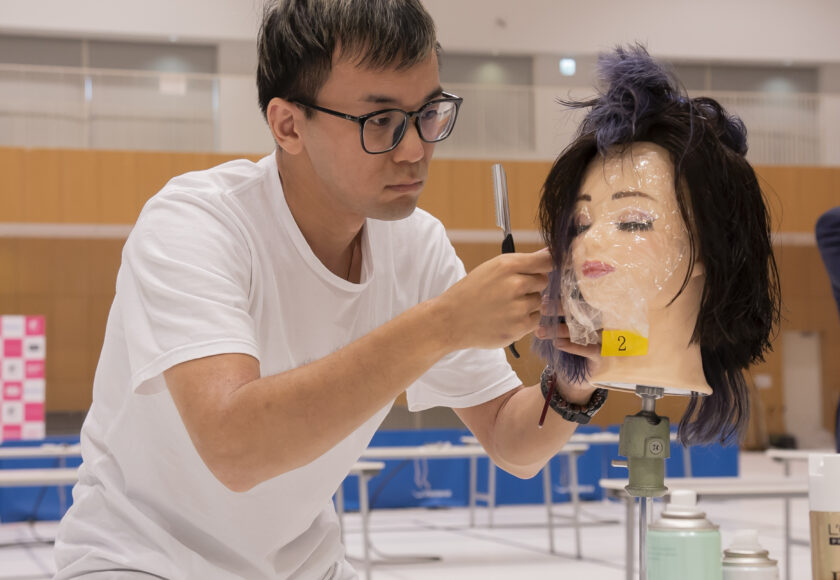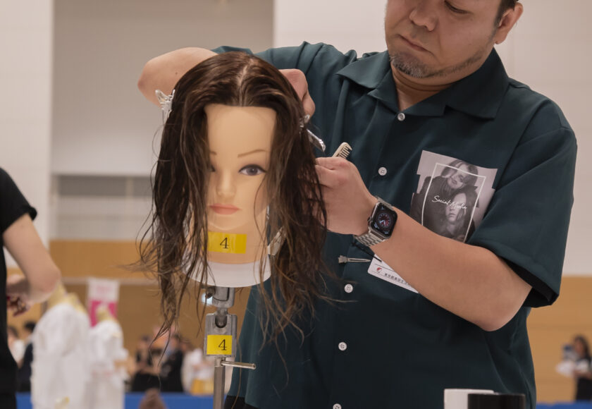 この課題は、必ずカールパーマ(ストレートパーマは禁止)、カラーリングを事前に施したモデルに対し、カット及びブローによりトレンドスタイル制作するもので、審査は全体的なトータルバランスで行うものとする。ヘアスタイル制作にあたって、作品に独自の創造性、発信性、ファッション性が表現させるものとする。